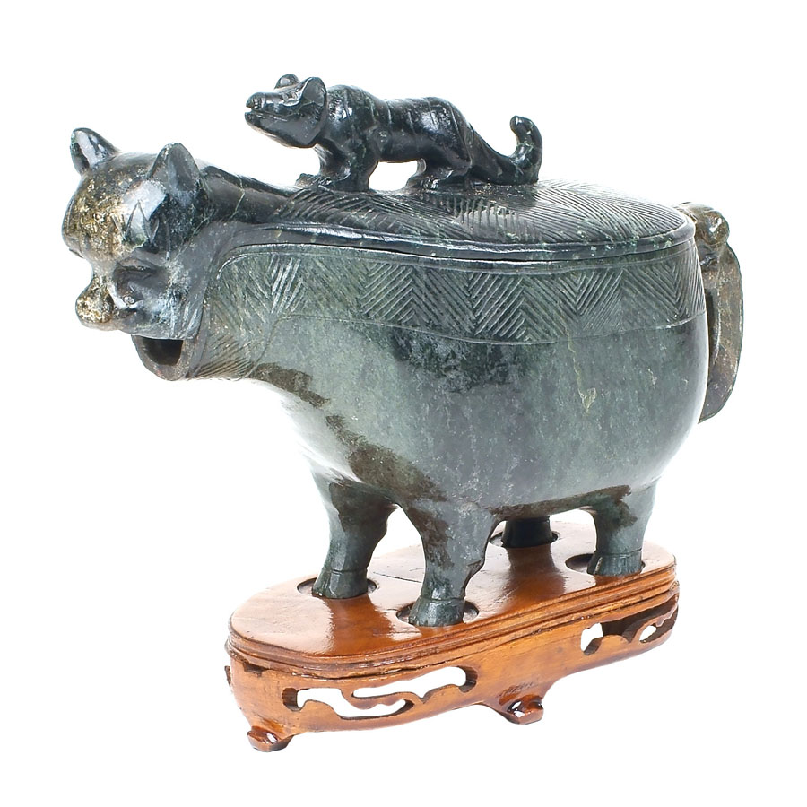 PARTICOLARE TEIERA IN PIETRA DURA manifattura orientale, XX Sec. a foggia di animale poggiante su base in legno AN ORIENTAL SEMI-PRECIOUS STONE TEA POT Oriental manufacture, 20th century On wooden base 15x20x8 cm.
