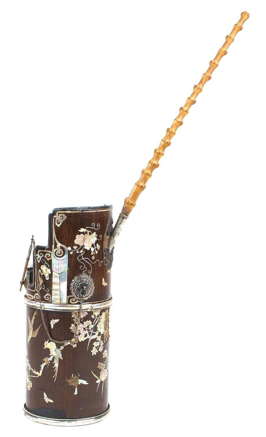 PARTICOLARE PIPA DA OPPIO Cina, XIX Sec. struttura in metallo rivestita da legno intarsiato in madreperla a motivi floreali (lievi mancanze) A CHINESE OPIUM PIPE 19th century Metal structure covered with wood and inlaid mother-of-pearl, losses 40x10 cm.