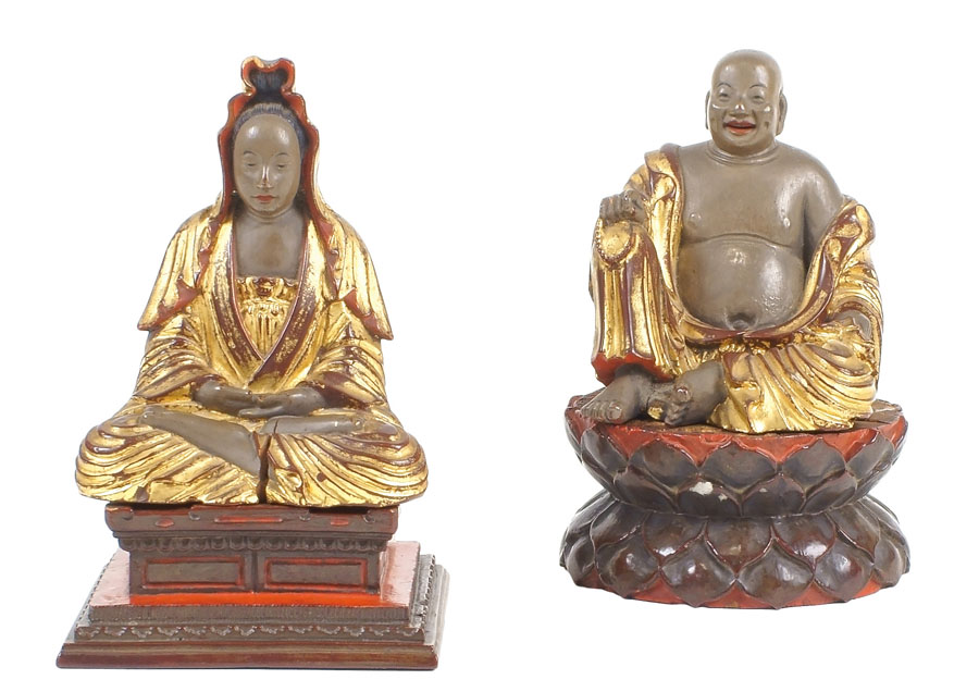 DUE SCULTURE IN LEGNO DORATO Cina, XIX Sec. e laccato raffiguranti un Buddha...