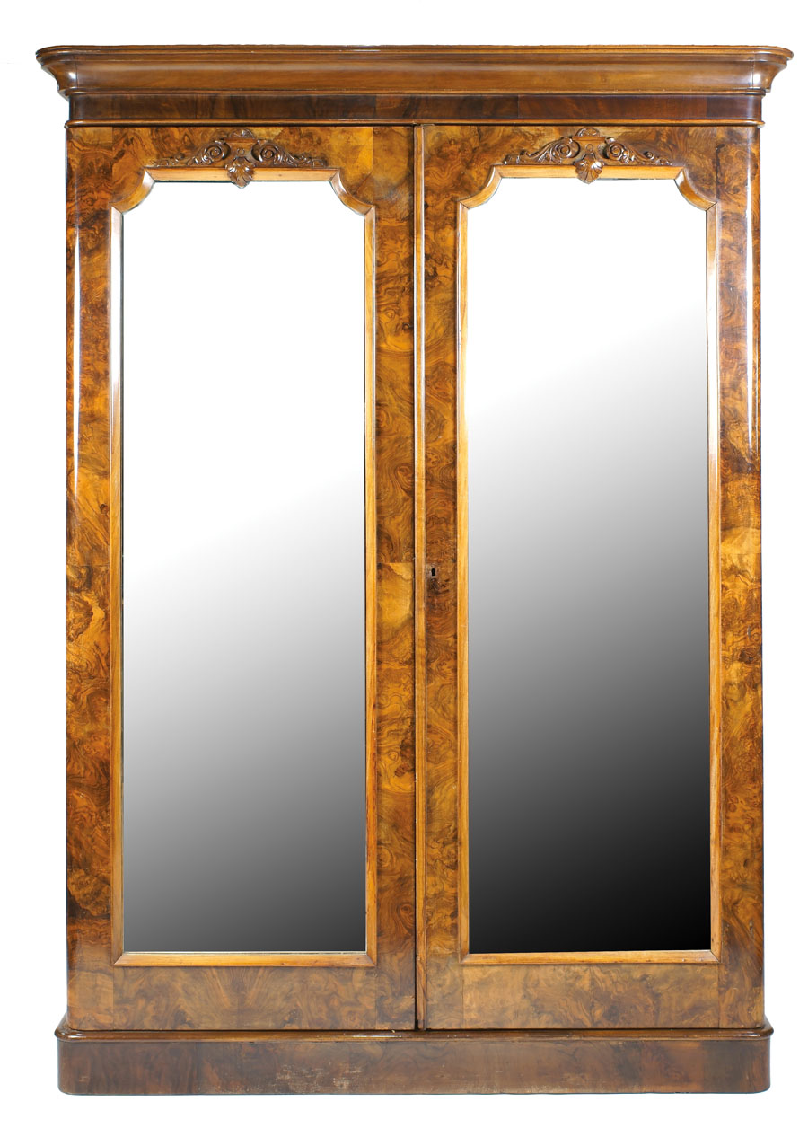 ARMADIO IN NOCE Inghilterra, XX Sec. fronte a due sportelli elementi in legno intagliato e specchi, all'interno cassetti e scomparti vari, difetti e mancanze AN ENGLISH WALNUT WARDROBE 20th century Defects and losses 210x153x59 cm.