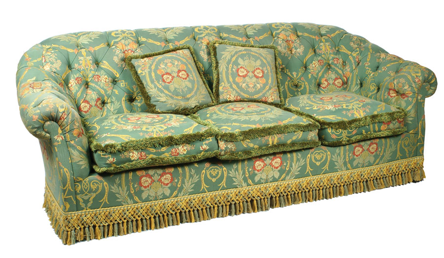DIVANO A TRE POSTI interamente imbottito e rivestito in tessuto, difetti A THREE-PLACE SOFA Fabric upholstering, defects 90x240x100 cm.