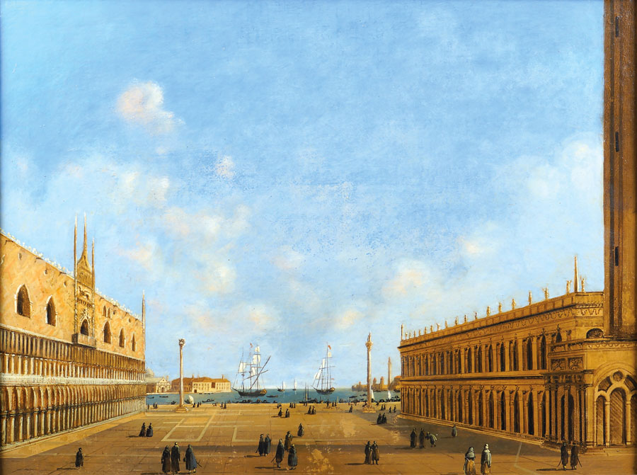 SCUOLA ITALIANA XIX Sec. "Veduta di Piazza San Marco", olio su tela, entro cornice, restauri ITALIAN SCHOOL 19th century "View of Piazza San Marco, Venice", oil on canvas, restorations 49x65 cm.