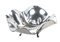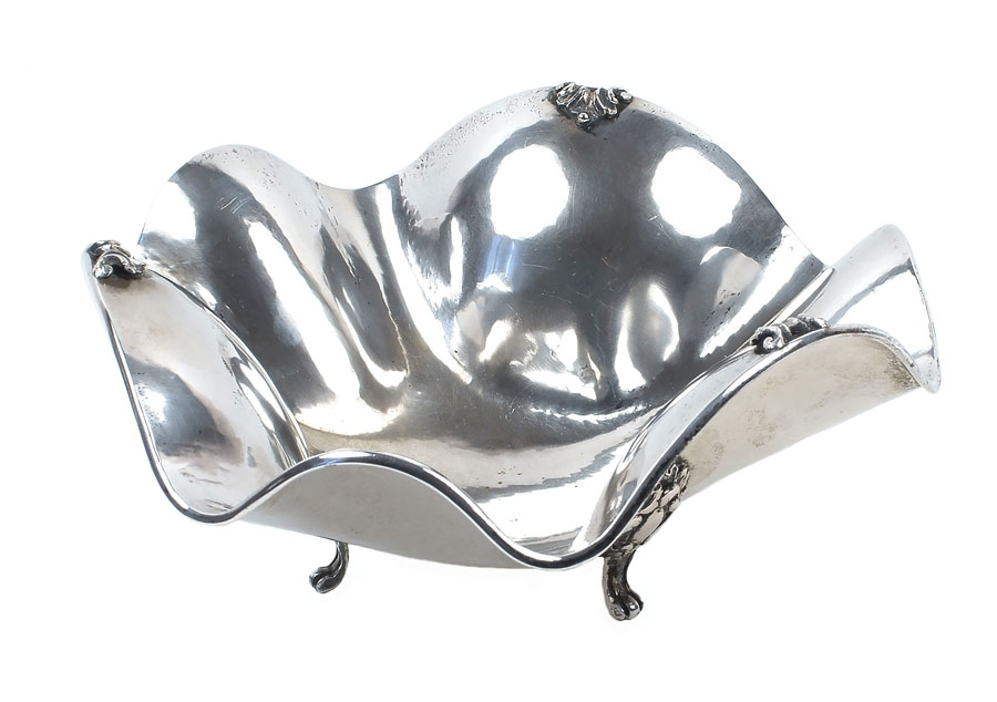 CENTROTAVOLA IN ARGENTO Italia, XX Sec. corpo liscio con profilo sagomato, poggiante su tre piedini a voluta, cm. 11x23x23 AN ITALIAN SILVER CENTREPIECE 20th century On three scroll-shaped legs peso 500 gr.