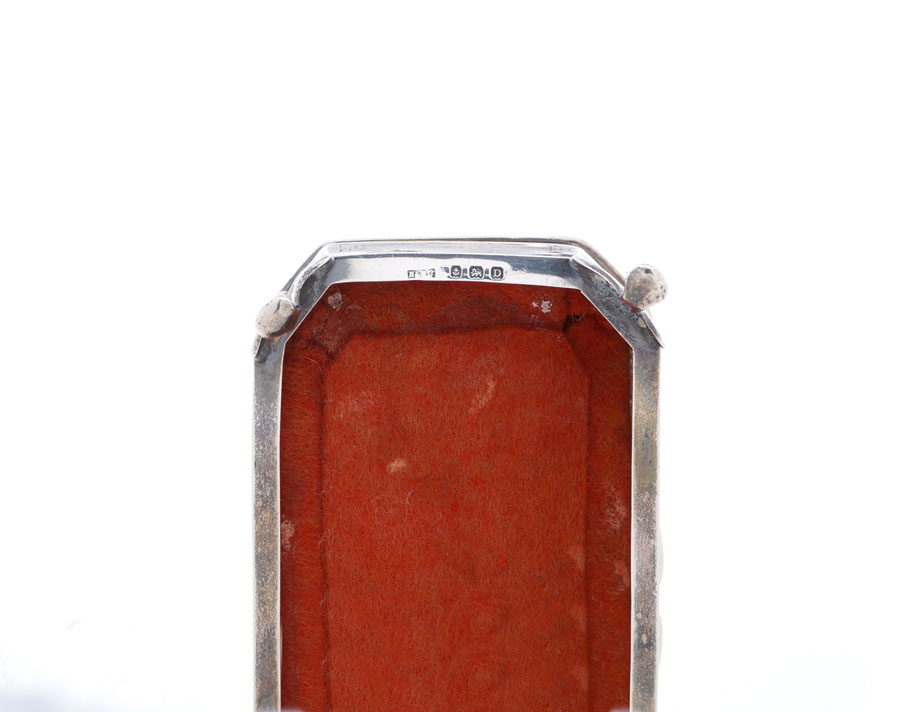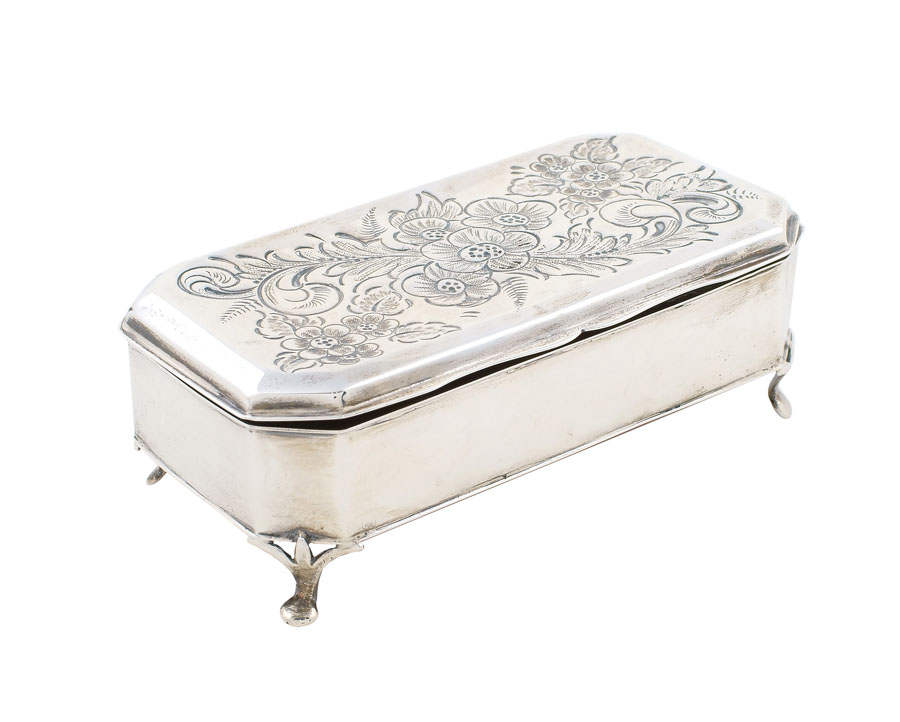 PORTAGIOIE IN ARGENTO Birmingham, 1928 coperchio sbalzato e decorato a motivi floreali, poggiante su quattro piedini, cm. 4,5x13,5x7 AN ENGLISH SILVER JEWEL CASE Birmingham, 1928 Floral decorations, on four legs peso 112 gr.