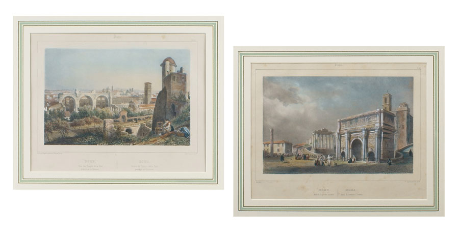 COPPIA DI STAMPE ENTRO CORNICI inizio XX Sec. raffiguranti "Il Tempio della Pace e L'Arco di Settimio Severo - Roma", lievi difetti A LOT OF TWO PRINTS 20th century respectively with scenes of Rome, framed, minor defects 25x32 cm.