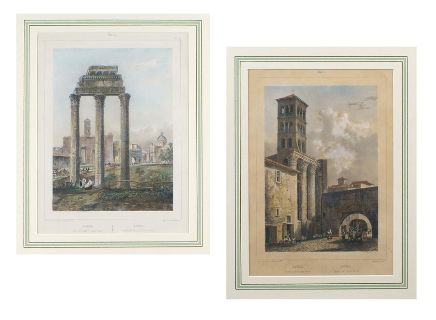 COPPIA DI STAMPE ENTRO CORNICI inizio XX Sec. raffiguranti "Il Foro di Nerva e il Tempio Giove Statore Arco - Roma", lievi difetti A LOT OF TWO PRINTS 20th century respectively with scenes of Rome, framed, minor defects 32x25 cm.