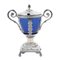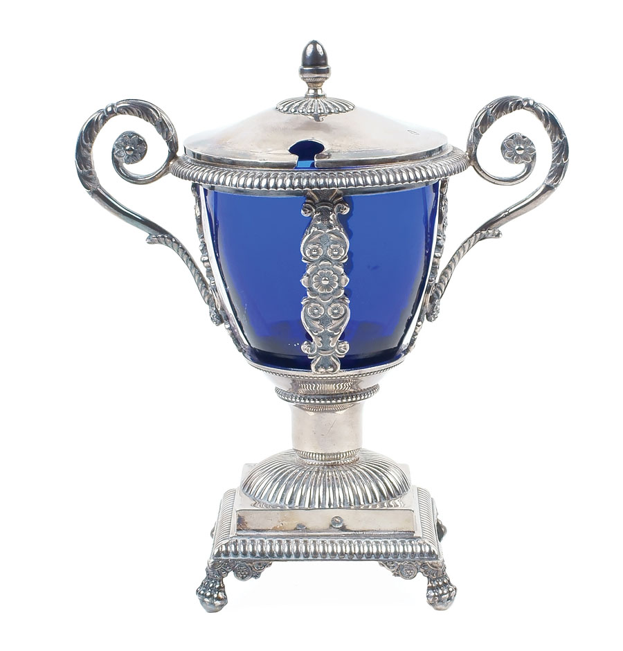 SALSIERA IN ARGENTO INCISO A MOTIVI FLOREALI Francia XIX Sec. prese a volute, interno in vetro opaline, h cm. 15 A FRENCH SILVER SALTCELLAR 19th century glass interior and scroll-shaped handles peso 232 gr.