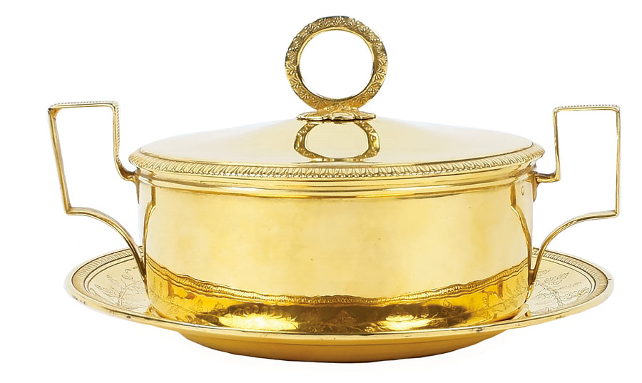 PICCOLA LEGUMIERA IN ARGENTO VERMEIL Parigi,1803 orafo A.D. Hubert a corpo liscio, profilo inciso a motivi di palmette, presa di forma circolare con due prese laterali sagomate, completa di piattino Parigi 1809-1819, cm. 9x17x12 A FRENCH SILVER VERMEIL VEGETABLE DISH WITH PLATE Paris, 1803 Silversmith A.D. Hubert peso 474 gr.