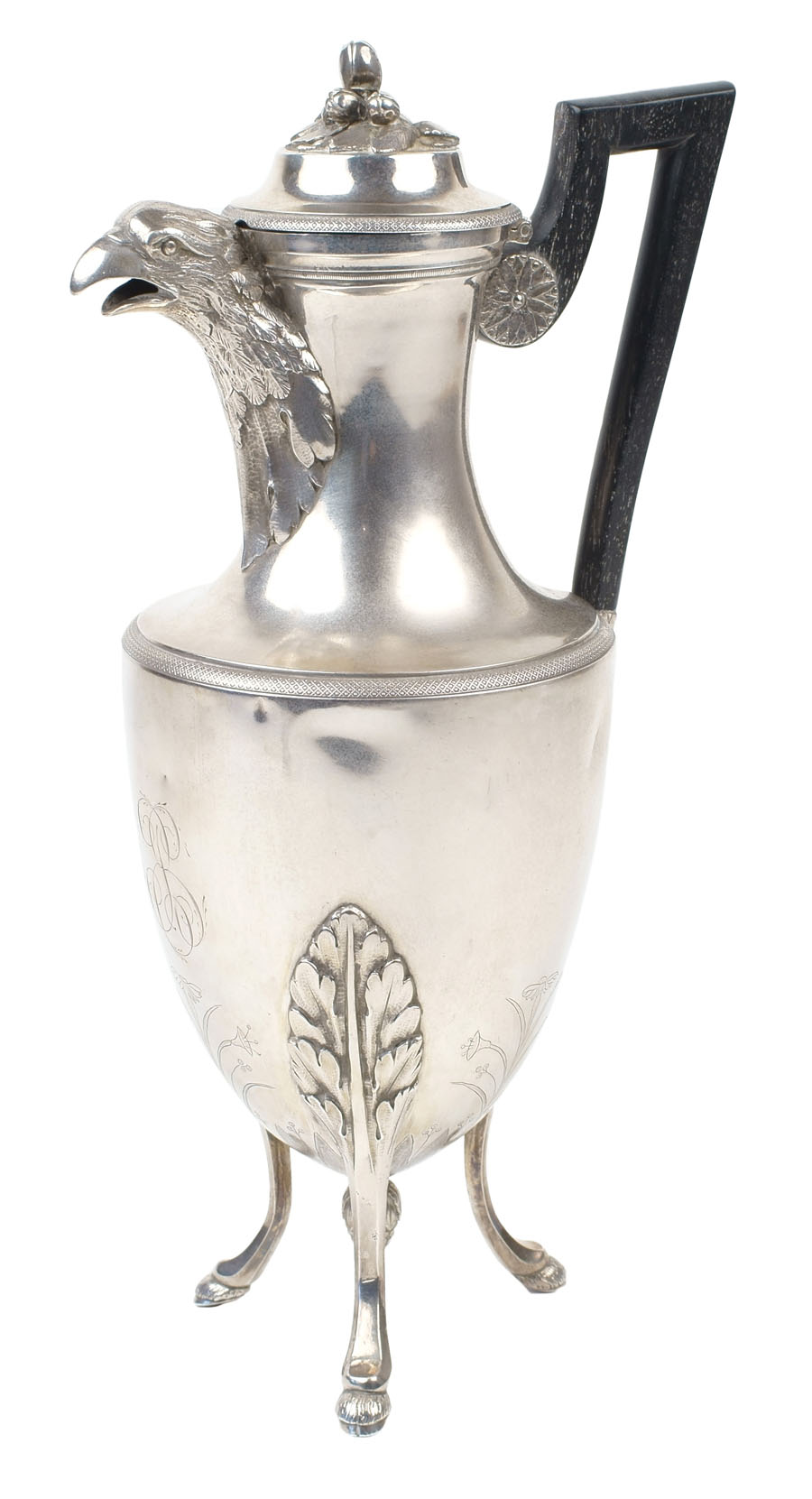 CAFFETTIERA IN ARGENTO Parigi 1789 -1809, orafo P.Joubert corpo piriforme poggiante su tre piedini, becco a testa di rapace, manico in legno, coperchio con presa a motivo di frutta , h. cm. 29, difetti A FRENCH SILVER COFFEE POT Paris 1789 - 1809 Silversmith P. Joubert, defects peso 732 gr.