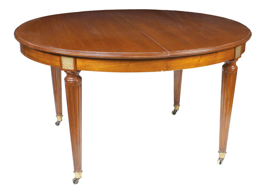 TAVOLO ALLUNGABILE IN MOGANO XX Sec. fascia sottostante con applicazioni in bronzo dorato, poggiante su quattro gambe scanalate provviste di rotelle, completo di due prolunghe da cm. 60 cadauna con difetti A PROLONGABLE MAHOGANY TABLE 20th century Top with ormolu applications, complete with two prolongation ( 60 cm), with defects 77x138x120 cm.