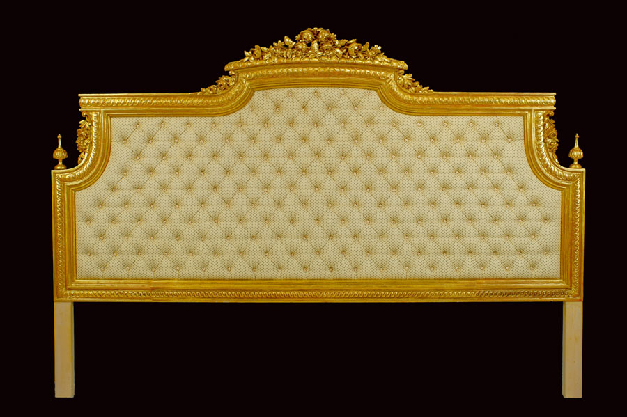 TESTATA DA LETTO IN LEGNO DORATO Francia, XX Sec. intagliato a motivi floreali, imbottita e rivestita in tessuto a manifattura Capitonnè, completa di sommier A FRENCH GILTWOOD HEADBOARD 20th century Upholstered in Capitonnè with cream-colored fabric, complete with sommier 140x200x210 cm.