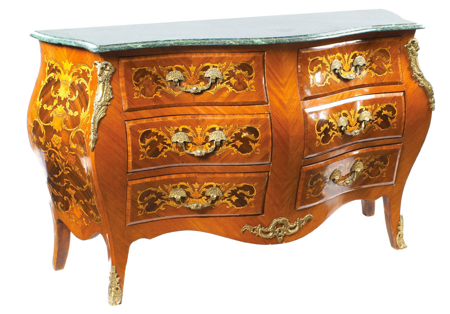 CASSETTONE IN STILE LUIGI XV XX Sec. intarsiato a motivi di volute, maniglie ed applicazioni in bronzo dorato, piano sagomato in marmo verde A LOUIS XV STYLE COMMODE 20th century Marquetry, ormolu applications and green marble top 90x146x54 cm.
