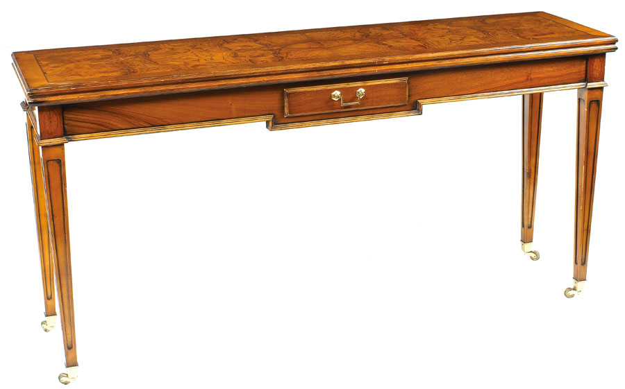 CONSOLE IN NOCE E RADICA XX Sec. piano rettangolare apribile con fascia sottostante centrata da un cassetto, poggiante su quattro gambe troncopiramidali provviste di rotelle, cm.76x150x80 (aperto) A WALNUT AND ROOT WOOD CONSOLE 20th century Rectangular top, can be opened, on four pyramidal legs 76x150x40 cm.