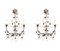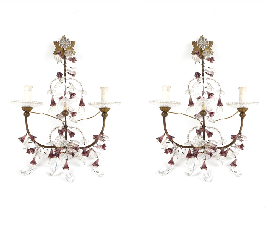 COPPIA DI APPLIQUES A DUE LUCI metà XX Sec. struttura in metallo dorato con pendenti in cristallo trasparente e colorato A METAL GILT TWO-BRANCH WALL-LIGHTS mid-20th century With crystal hangings 44x35 cm.
