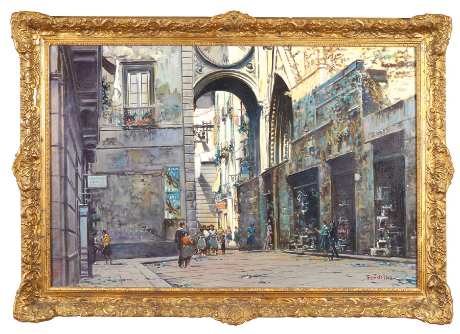 FERDINANDO DEL BASSO S. Agata dei Goti 1897- Napoli 1971 "Arco di Sant' Eligio a Napoli", olio su tela, firmato Ferdelba in basso a destra, entro cornice FERDINANDO DEL BASSO S. Agata dei Goti 1897- Naples 1971 "Arch of Sant'Eligio in Naples", oil on canvas, signed Ferdelba (lower right), framed 63x91 cm.
