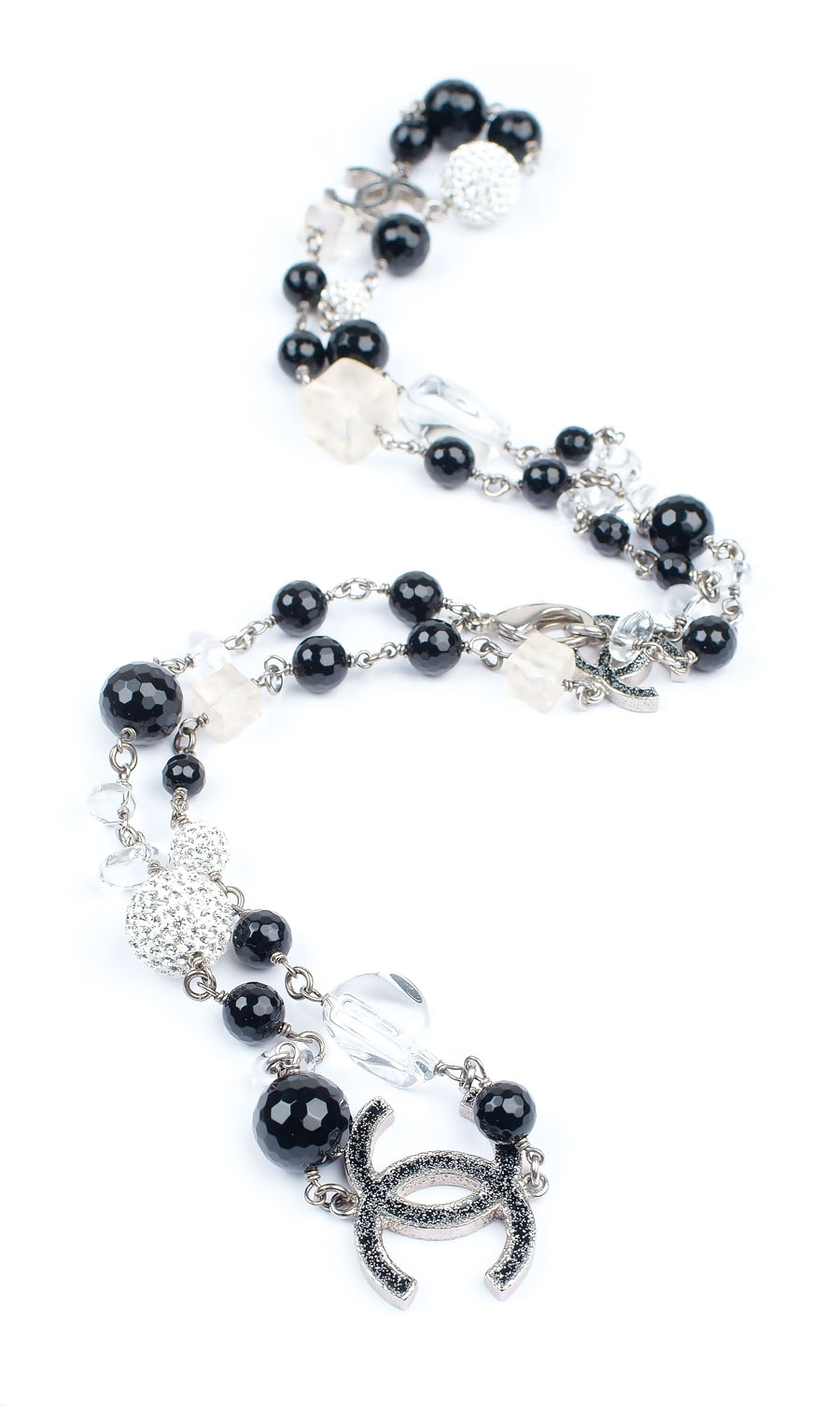 CHANEL, COLLANA BIJOU VINTAGE firmata in metallo e strass con perle in pasta di vetro A BIJOU VINTAGE METAL AND RHINESTONE CHANEL NECKLACE Mark of Chanel l. 80 cm.