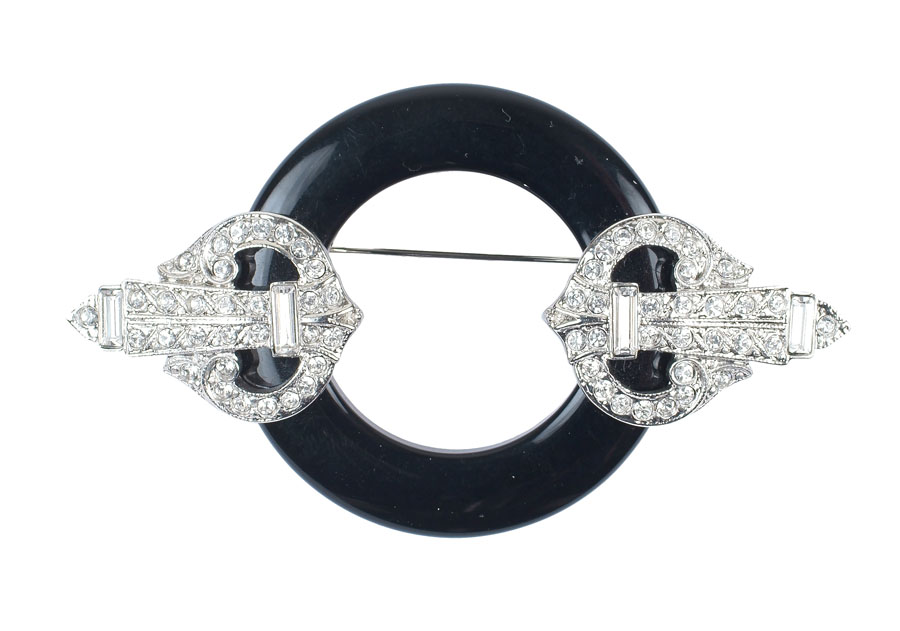 KENNETH J. LANE, SPILLA BIJOU VINTAGE firmata collezione Decò in metallo, resina nera e strass A BIJOU VINTAGE METAL AND RHINESTONE KENNETH J. LANE BROOCH Mark of Kenneth J. Lane, Decò collection