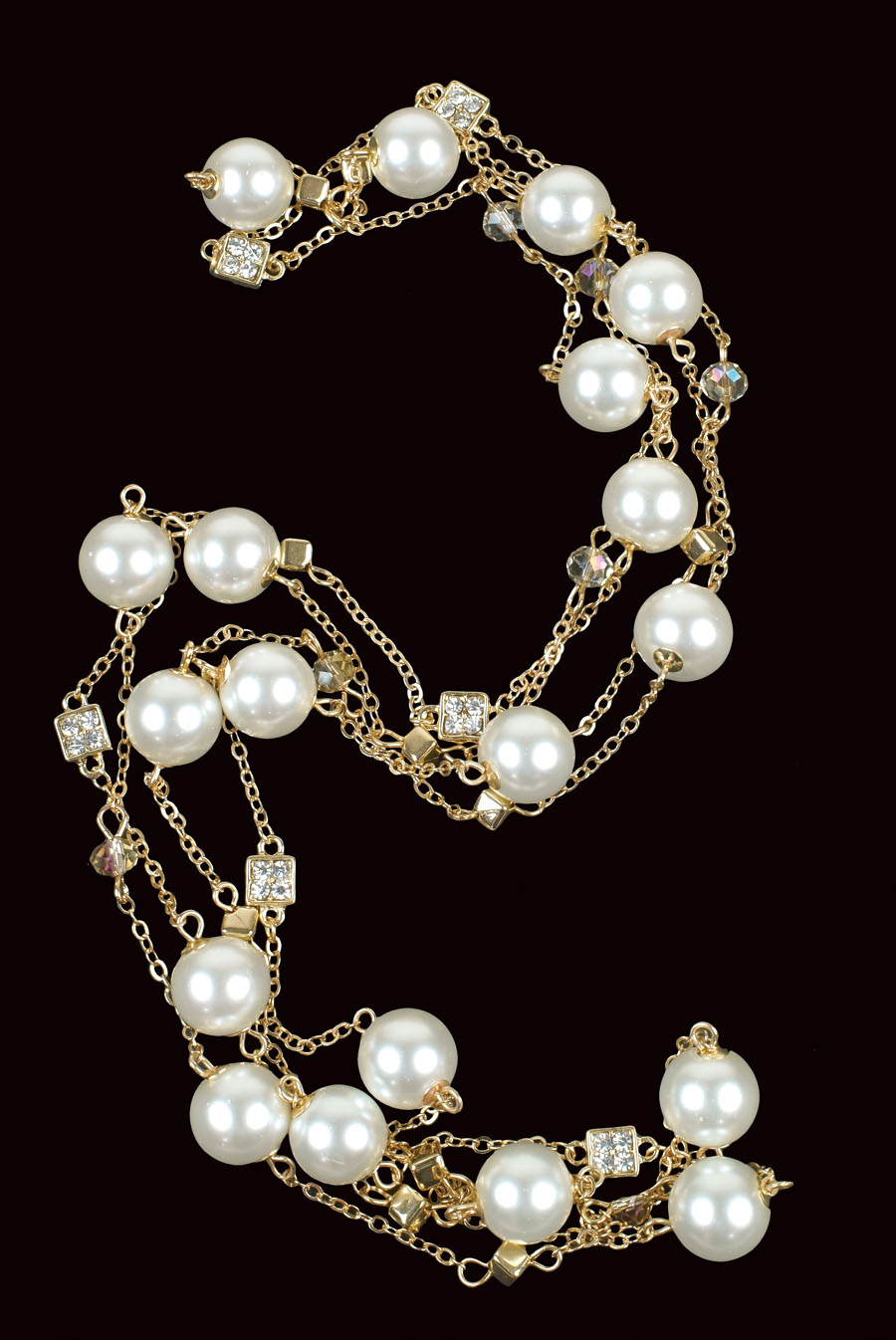LUNGA COLLANA BIJOU IN METALLO DORATO con sfere a simulare perle e strass A BIJOU METAL-GILT NECKLACE Con spheres simulating pearls l. 160 cm.