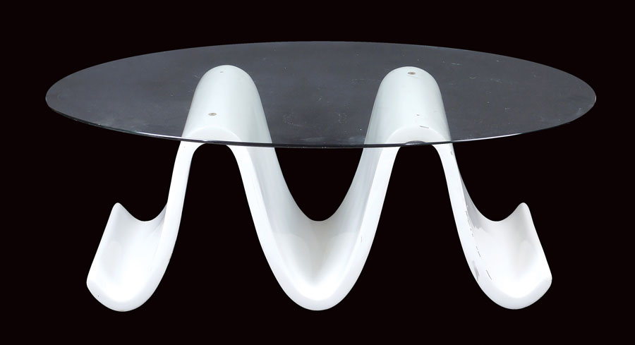 TAVOLINO VINTAGE DA SALOTTO anni 70 piano ovale in cristallo poggiante su base sagomata in resina bianca, difetti A VINTAGE SOFA TABLE 1970s Crystal top with white resin base, defects 42x120x70,5 cm.