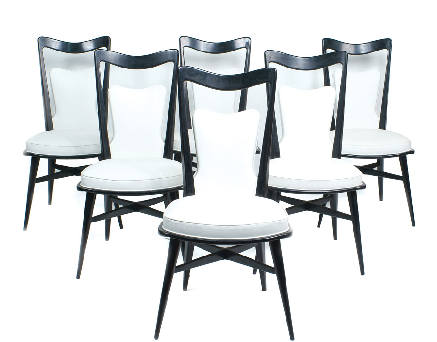 SEI SEDIE IN LEGNO EBANIZZATO anni 50/60 struttura di linea arcuata, gambe a cono riunite al centro da crociera, sedute e schienali imbottiti e rivestiti in ecopelle bianca A SET OF SIX EBONIZED WOOD CHAIRS 1950/60s Seating and chair-back covered with white synthetic leather h. 94 cm.