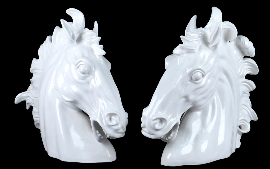 DUE TESTE DI CAVALLO DISEGNO GUCCI Firenze, XX Sec. in porcellana bianca A COUPLE OF TWO PORCELAIN HORSE HEADS AFTER GUCCI Florance, 20th century In white porcelain 50x50x19 cm.