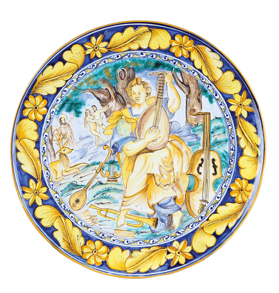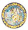 GRANDE PIATTO IN MAIOLICA Italia, XX Sec. dipinto in policromia nella tonalità del giallo AN ITALIAN MAJOLICA PLATE 20th century painted with Christian scenes in yellow and blue d. 50 cm.