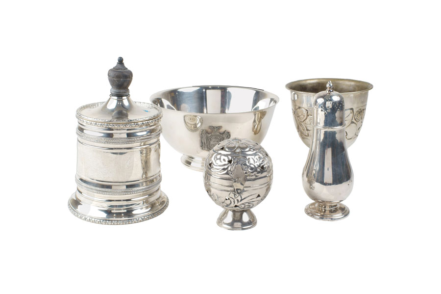 CINQUE OGGETTI IN METALLO ARGENTATO fogge e manifatture diverse A LOT OF SILVERED METAL (5) Different shapes and manufactures
