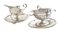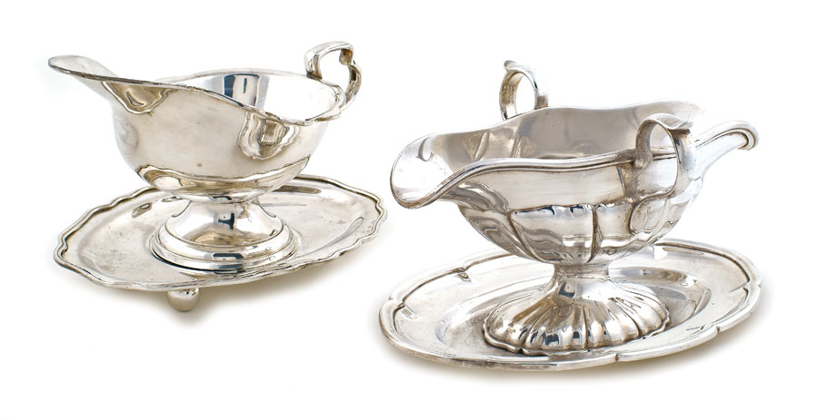 DUE SALSIERE IN METALLO ARGENTATO COMPLETE DI VASSOIETTO fogge e misure diverse TWO SILVERED METAL SAUCIERS WITH PLATE Different dimensions