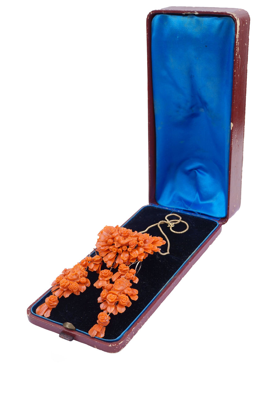 IMPORTANTE PARURE IN CORALLO MEDITERRANEO ROSSO XIX Sec. a motivo floreale con putti e volti femminili, composta da un paio di orecchini ed un pendente completo di collanina in oro giallo 18kt, entro astuccio AN IMPORTANT MEDITERRANEAN RED CORAL PARURE 19th century Decorated with putti and roses, set consisting of a pair of coral earrings and a 18kt gold chain with a coral pendant, with case peso 41,8 gr.