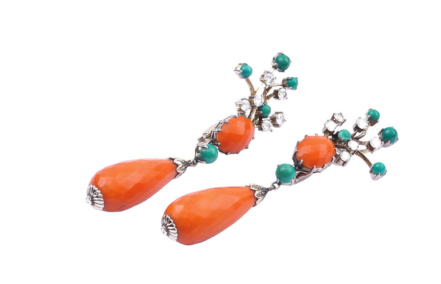 ORECCHINI PENDENTI IN ORO BIANCO 18KT XIX Sec. con corallo mediterraneo rosso taglio briolet, diamanti taglio brillante per ct 1 circa e calcedonio verde 18KT WHITE GOLD, CORAL AND GREEN CALCEDONIO PENDANT EARRINGS 19th century Briolet-cut red Mediterranean coral, ct 1 brilliant-cut diamond peso 18,6 gr.