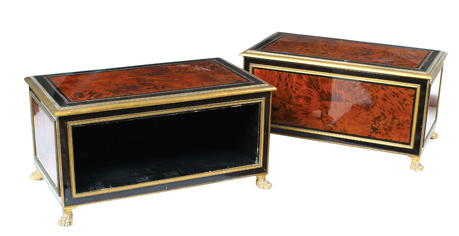 COPPIA DI BASI IN LEGNO EBANIZZATO E RADICA DI TUIA fine XIX Sec. applicazioni e piedini ferini in bronzo dorato A PAIR OF THUJA AND EBONIZED WOOD BASES late 19th century With ormolu applications 36x70x40 cm.