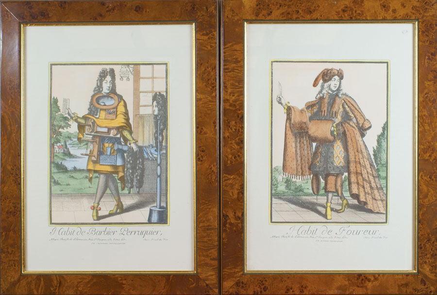 COPPIA DI STAMPE, DA NICOLAS DE LARMESSIN II Francia, XX Sec. raffiguranti "Habit de Barbier Perruquier- Habit de Foureur", entro cornici A PAIR OF PRINTS FROM NICOLAS DE LARMESSIN II France, 20th century "Habit de Barbier Perruquier- Habit de Foureur", framed 60x44 cm.