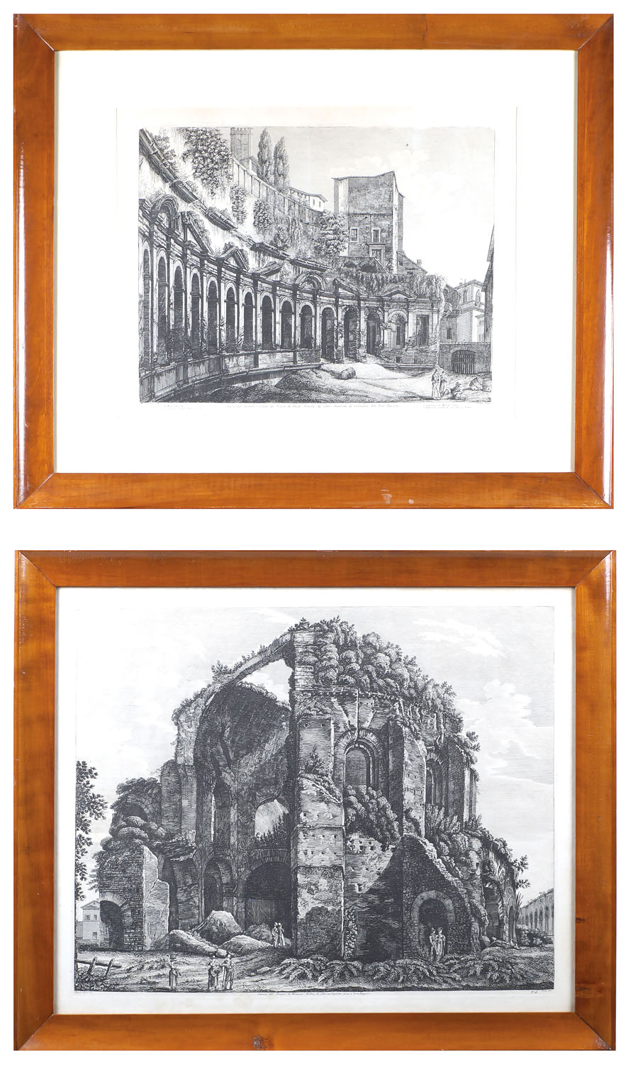 LUIGI ROSSINI Ravenna 1790 - 1857 "Veduta del secondo ordine dei bagni di Paolo Emilio - Avanzo del tempio di Minerva Medica", coppia di incisioni, entro cornice LUIGI ROSSINI (2) Ravenna 1790 - 1857 "View of the second order of the baths of Paolo Emilio" and "The Minerva Medica temple", framed etchings 50x60 cm.