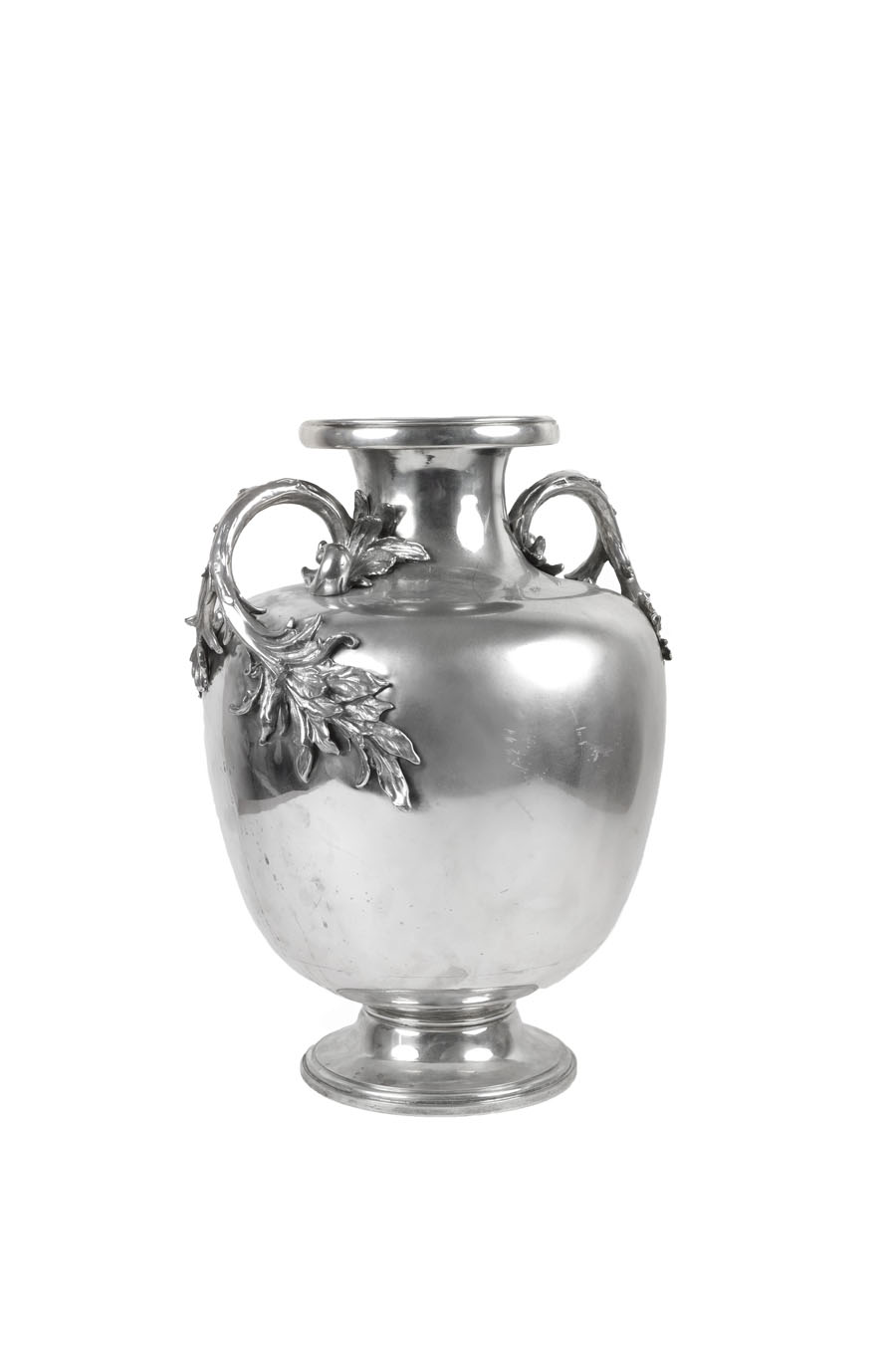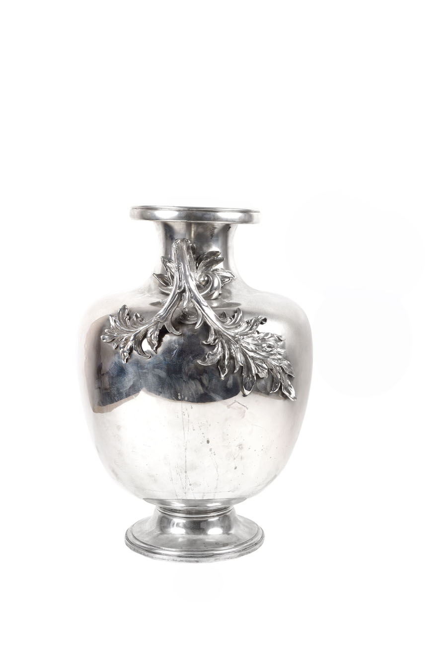 GRANDE VASO IN ARGENTO Milano, XX Sec. corpo liscio con due manici sbalzati e cesellati a motivo vegetale e di volute, base circolare, difetti, cm. 50x43 AN ITALIAN SILVER VASE Milan, 20th century Circular base, defects peso 6100 cm.