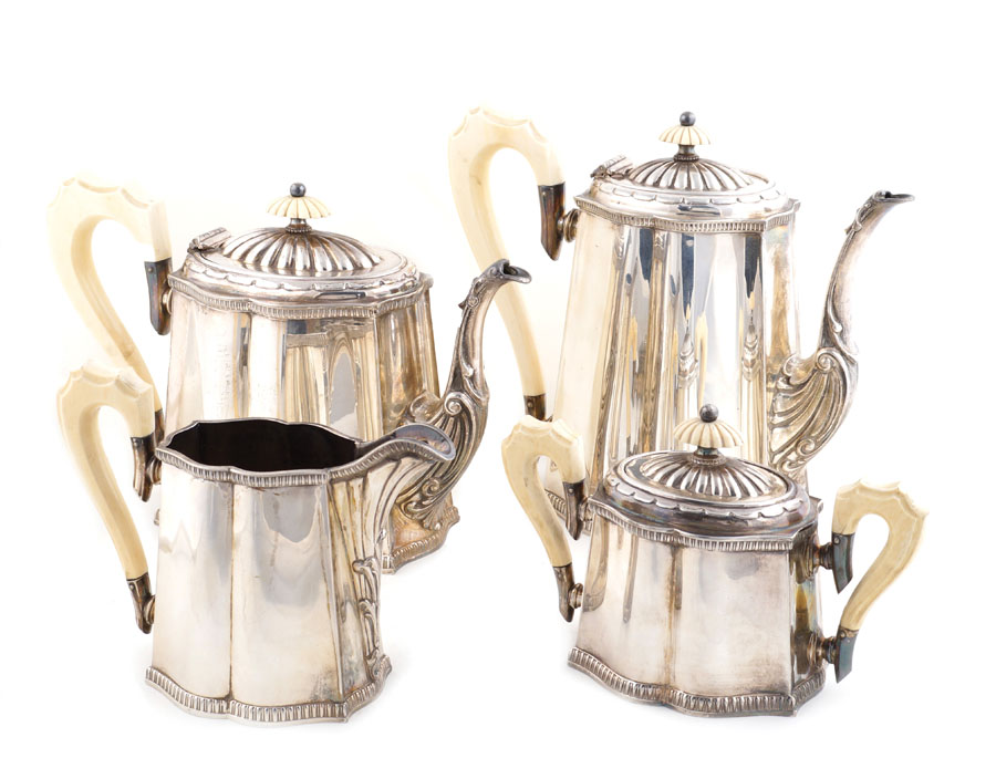SERVIZIO THE E CAFFè IN ARGENTO Italia, bollo Fascio anni 30-40 firmato Astrea Roma, corpo liscio su base esagonale, profilo godronato, manici a voluta in avorio, composto da una teiera, una caffettiera, una lattiera e una zuccheriera AN ITALIAN SILVER TEA AND COFFEE SERVICE fascist mark 1930/40s Mark of Astrea Rome, plain silver on hexagonal base, ivory handles, comprising a teapot, a coffeepot, a milk can and a sugar bowl peso lordo 3300 gr.