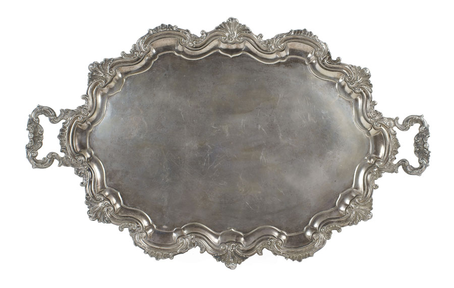 GRANDE VASSOIO IN ARGENTO A DUE MANICI Regno Lombardo Veneto, XIX Sec. profilo sagomato e sbalzato a motivi di volute AN ITALIAN SILVER TRAY Kingdom of Lombardy Venetia, 19th century With two handles peso 4300 gr.