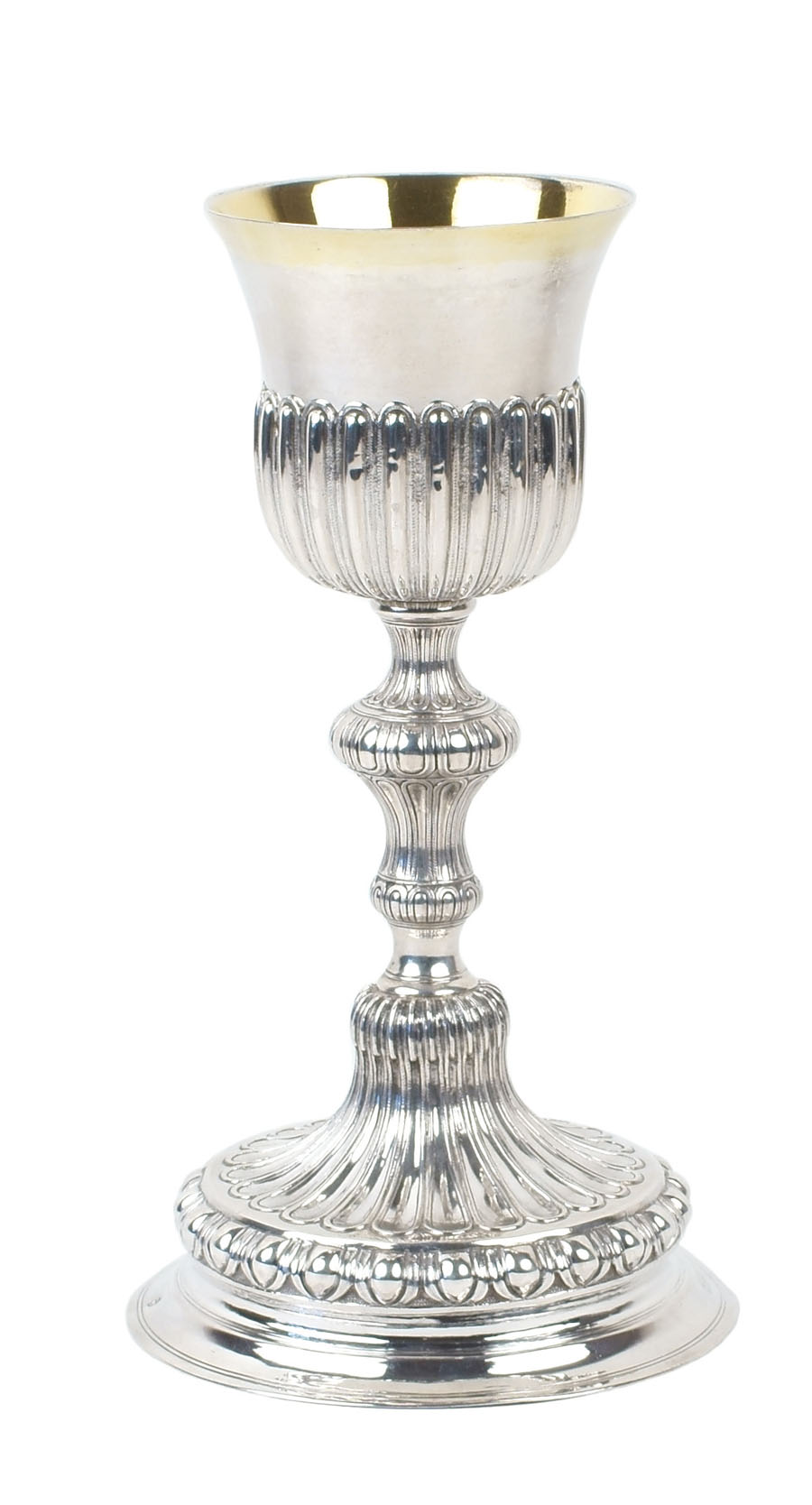 CALICE IN ARGENTO Roma, XIX Sec. base circolare baccellata, nodo a balaustro, coppa con interno in argento vermeil, h. cm. 23, difetti AN ITALIAN SILVER CHALICE Rome, 19th century Vermeil interior peso 390 gr.