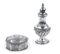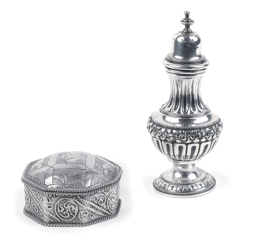 DUE OGGETTI IN ARGENTO XX Sec. una scatolina di forma ottagonale e una saliera, misure diverse A SILVER LOT (2) 20th century comprising one box and one salt cellar peso 133 gr.