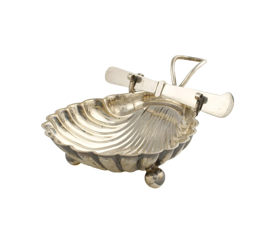 PORTABURRO IN ARGENTO Italia, XX Sec. a foggia di conchiglia poggiante su tre piedini a sfera, completo di coltellino, cm. 6x19x11,5 AN ITALIAN SILVER BUTTER DISH 20th century On three spherical legs, complete with spoon peso 174 gr.