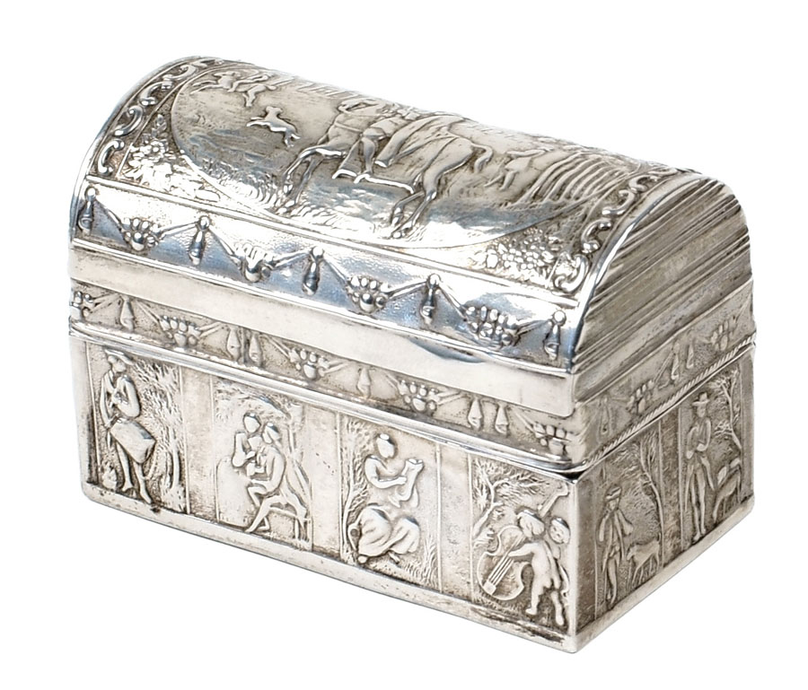 SCATOLA A BAULETTO IN ARGENTO manifattura europea, XIX Sec. sbalzata ed incisa a motivi di figure entro ghirlande de floreali, cm. 6x8,5x4,5 A VALISE-SHAPED SILVER BOX European manufacture, 19th century With floral festoon decorations peso 96 gr.