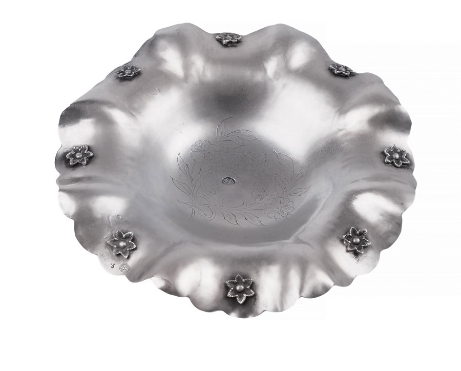 CESTINO IN ARGENTO manifattura orientale, fine XIX Sec. profilo smerlato con fiori applicati, d. cm. 19 AN ORIENTAL SILVER BASKET late 19th century With scalloped borders peso 322 gr.