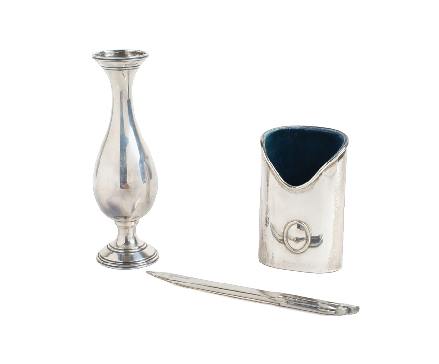 TRE OGGETTI DA SCRIVANIA IN ARGENTO XX Sec. un portapenne con interno in velluto, un tagliacarte Bulgari e un piccolo vaso, difetti A LOT OF THREE SILVER PIECES 20th century comprising a pen-holder, a Bulgari paper knife and a small vase, defects peso 361 lordo gr.