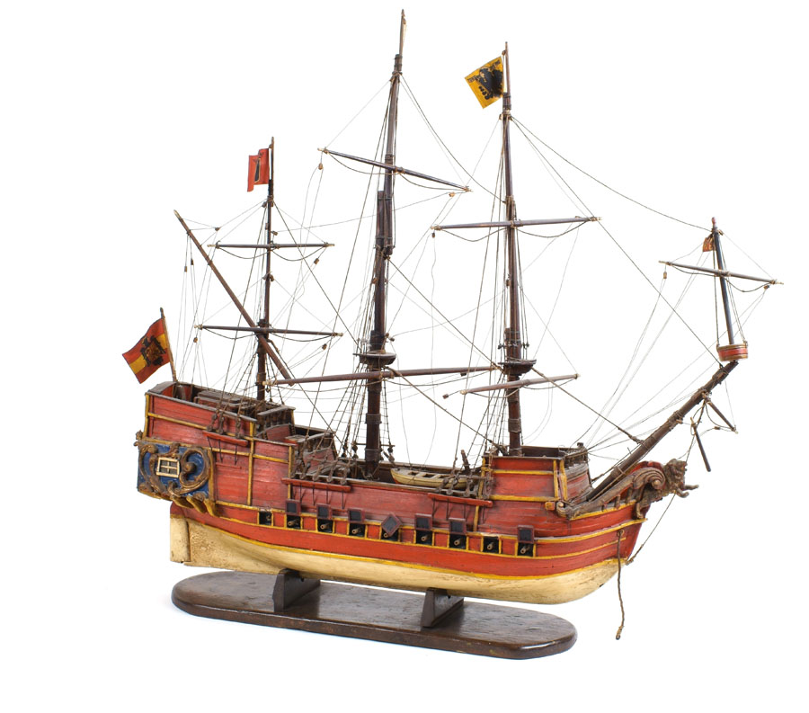 MODELLO DI ANTICO GALEONE SPAGNOLO vecchia manifattura struttura in legno dipinto, bandiera della provincia di Castiglia e Leon, difetti e mancanze A MODEL OF AN ANTIQUE SPANISH GALLEON old manufacture Painted wooden structure with the flag of Castiglia and Leon, defects and losses 72x70x25,5 cm.
