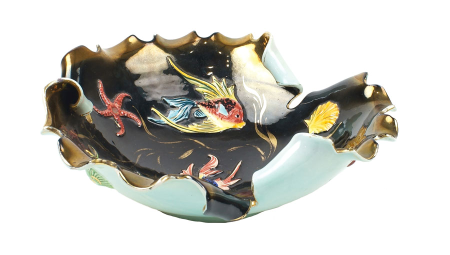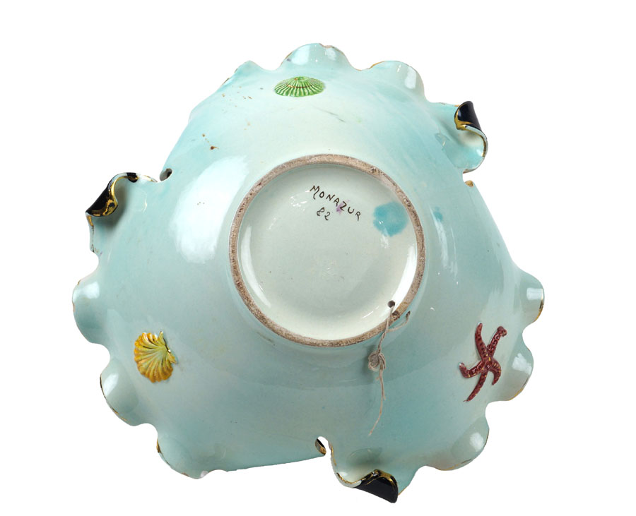 CENTROTAVOLA VINTAGE IN CERAMICA MONAZUR Francia, XX Sec. dipinto in policromia e decorato a motivo di pesci, lievi difetti A MONAZUR VINTAG CENTREPIECE France, 20th century Decorated with underwater motifs, minor defects 11x34 cm.