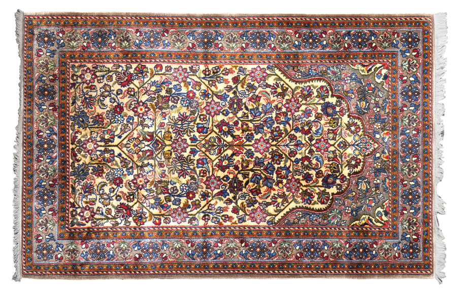 TAPPETO KASHAN KORK Persia,XX Sec. disegno a preghiera a motivi floreali su fondo avorio, ordito in cotone, trama e vello in lana Kork A KASHAN KORK RUG Persia, 20th century Cotton foundation with Kork wool pile 159x108 cm.
