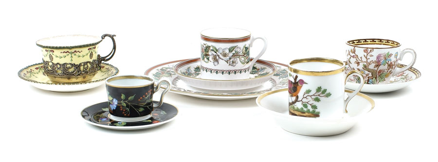 CINQUE TAZZE CON PIATTINO IN PORCELLANA POLICROMA XIX-XX Sec. manifatture e fogge diverse A SET OF PORCELAIN CUPS WITH PLATES (5) late 19th/early 20th century Different shapes and manufactures