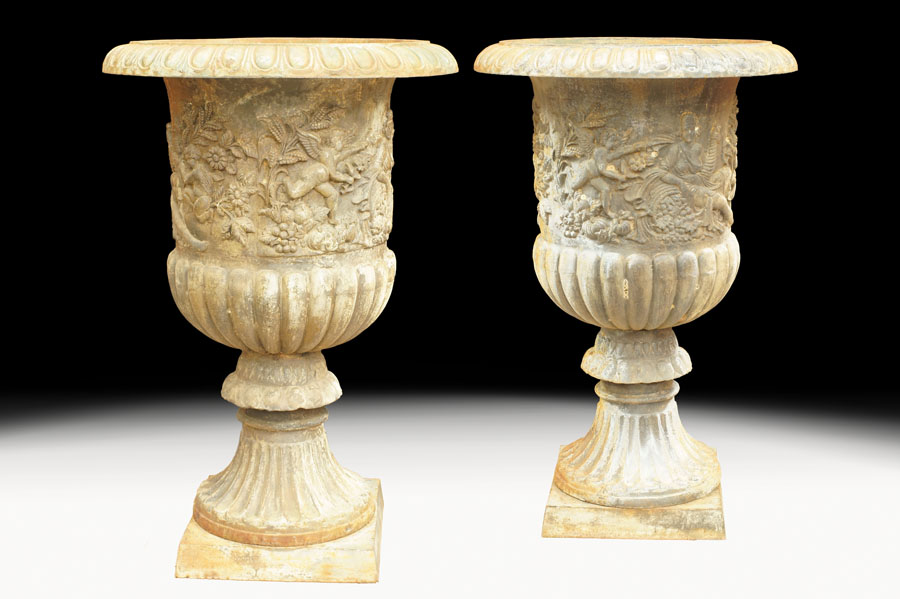 COPPIA DI GRANDI VASI MEDICEI IN GHISA fine XIX Sec. bordo baccellato e corpo...