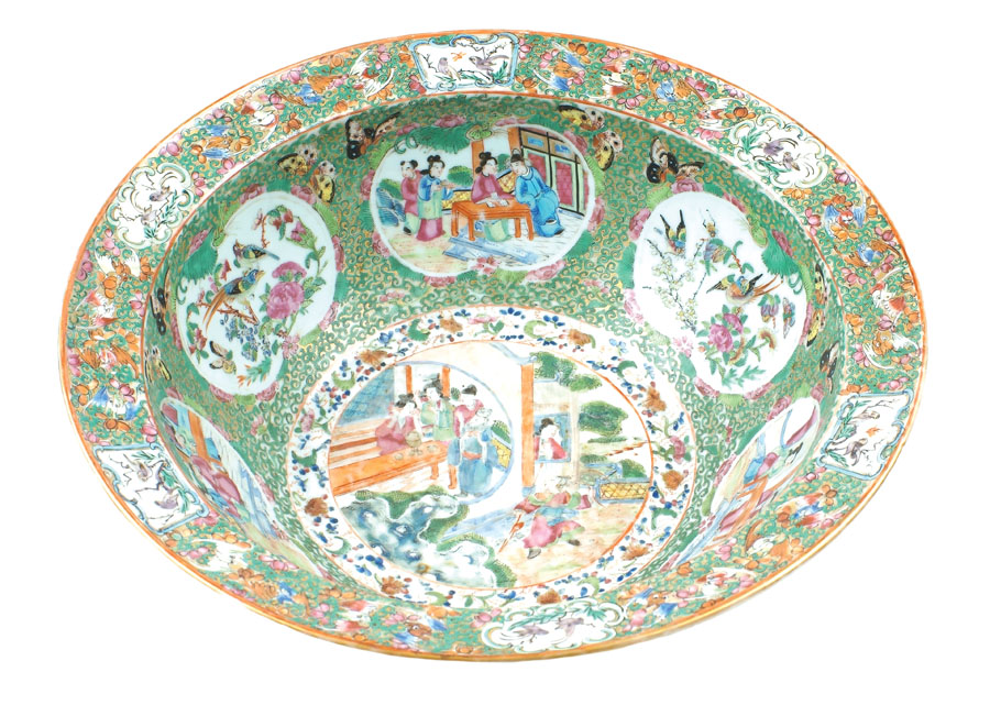 GRANDE BOWL IN PORCELLANA POLICROMA Cina, XIX Sec. decorata a motivi floreali, di farfalle e scene di vita entro riserve A CHINESE PORCELAIN BOWL 19th century Floral decoration and life scenes framed by butterflies 14x41 cm.