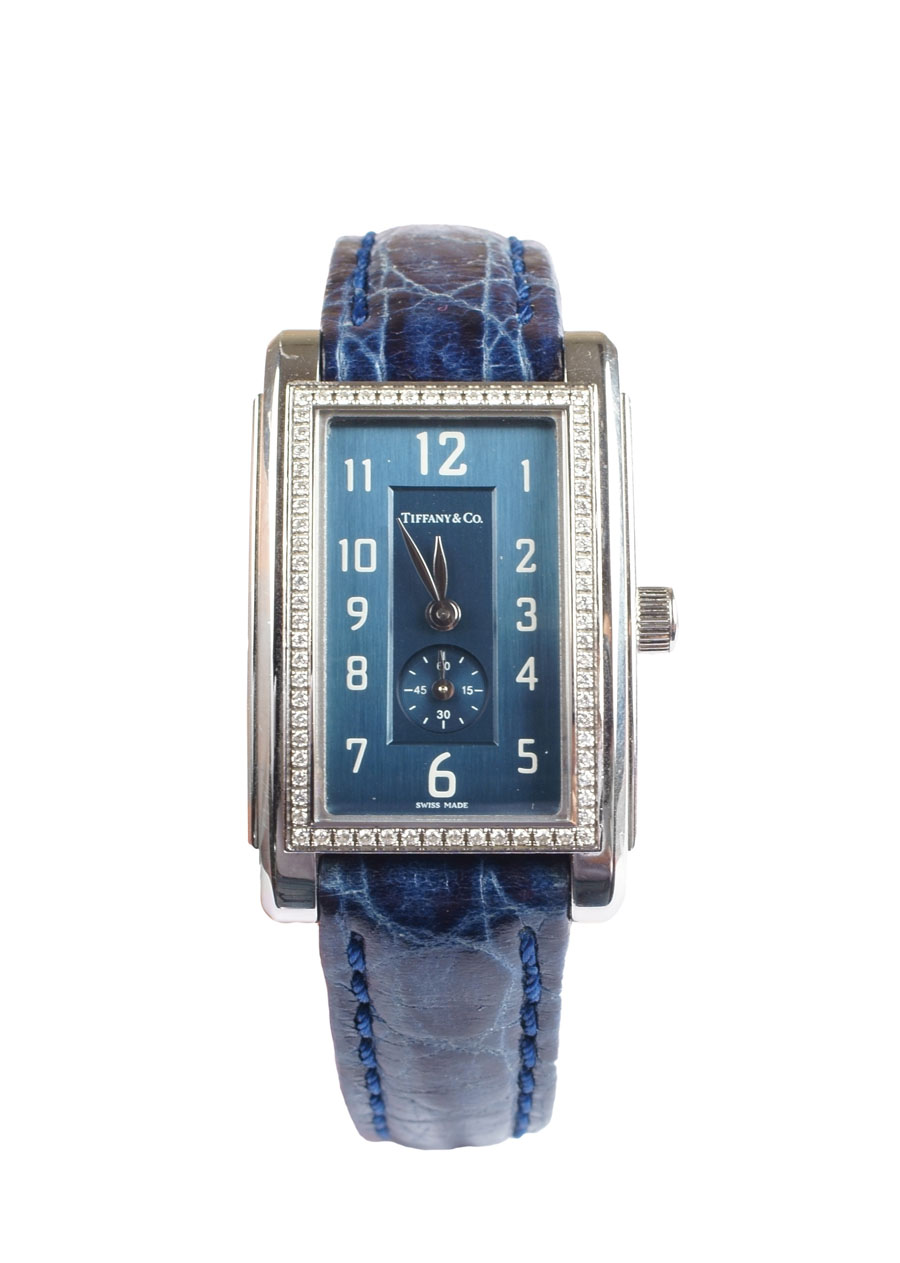 TIFFANY & CO. GRAND QUARZ RESONATOR LADY ref. 19474623 orologio in acciaio, cassa rettangolare mm. 34x20 con diamanti taglio brillante, quadrante blu contasecondi ore 6, movimento al quarzo, cinturino in coccodrillo con fibbia originale in acciaio, scatola e garanzia A STEEL TIFFANY & CO. GRAND QUARTZ RESONATOR LADY'S WRISTWATCH Ref. 19474623 Dial with brilliant-cut diamonds, quartz movement, crocodile leather strapp, with case and guarantee