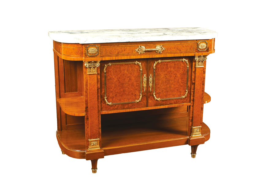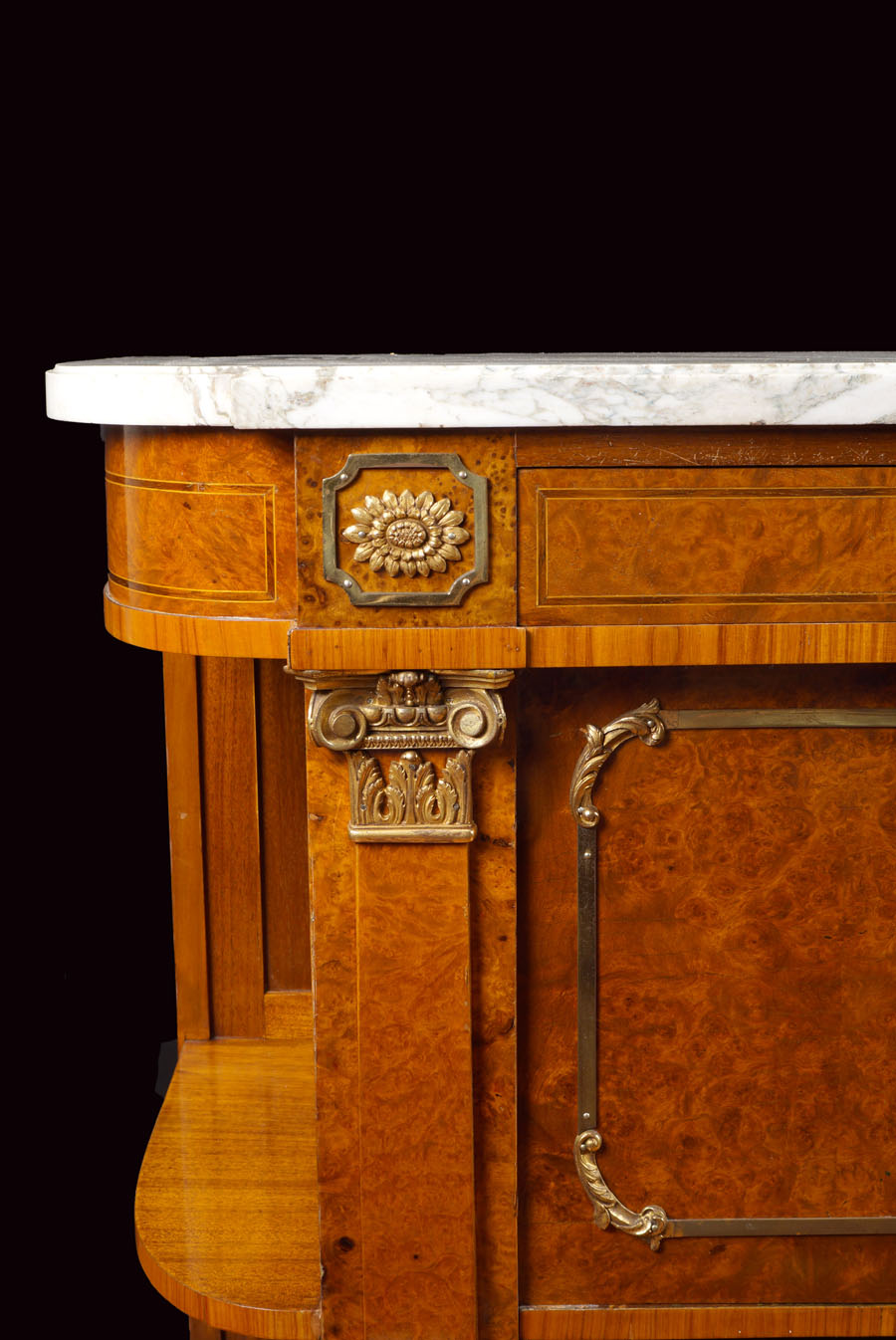CREDENZA IN RADICA DI TUIA Francia, fine del XIX Sec. piano sagomato in marmo, fronte ad un cassetto e due sportelli delimitati da lesene ed un ulteriore ripiano a giorno sottostante, maniglie, fregi e cornici in bronzo dorato e finemente cesellato A FRENCH THUJA-WOOD CREDENZA late 19th century Marble top and ormolu applications, with one drawer and two doors 100x130x50 cm.